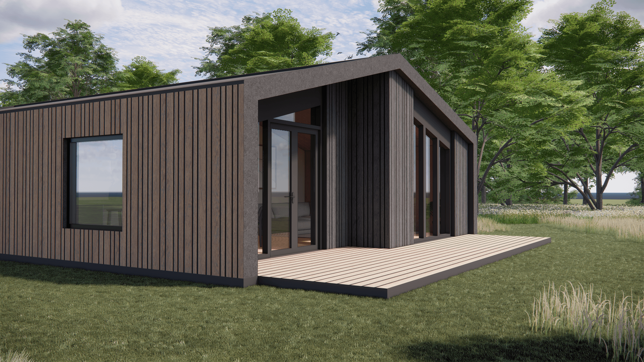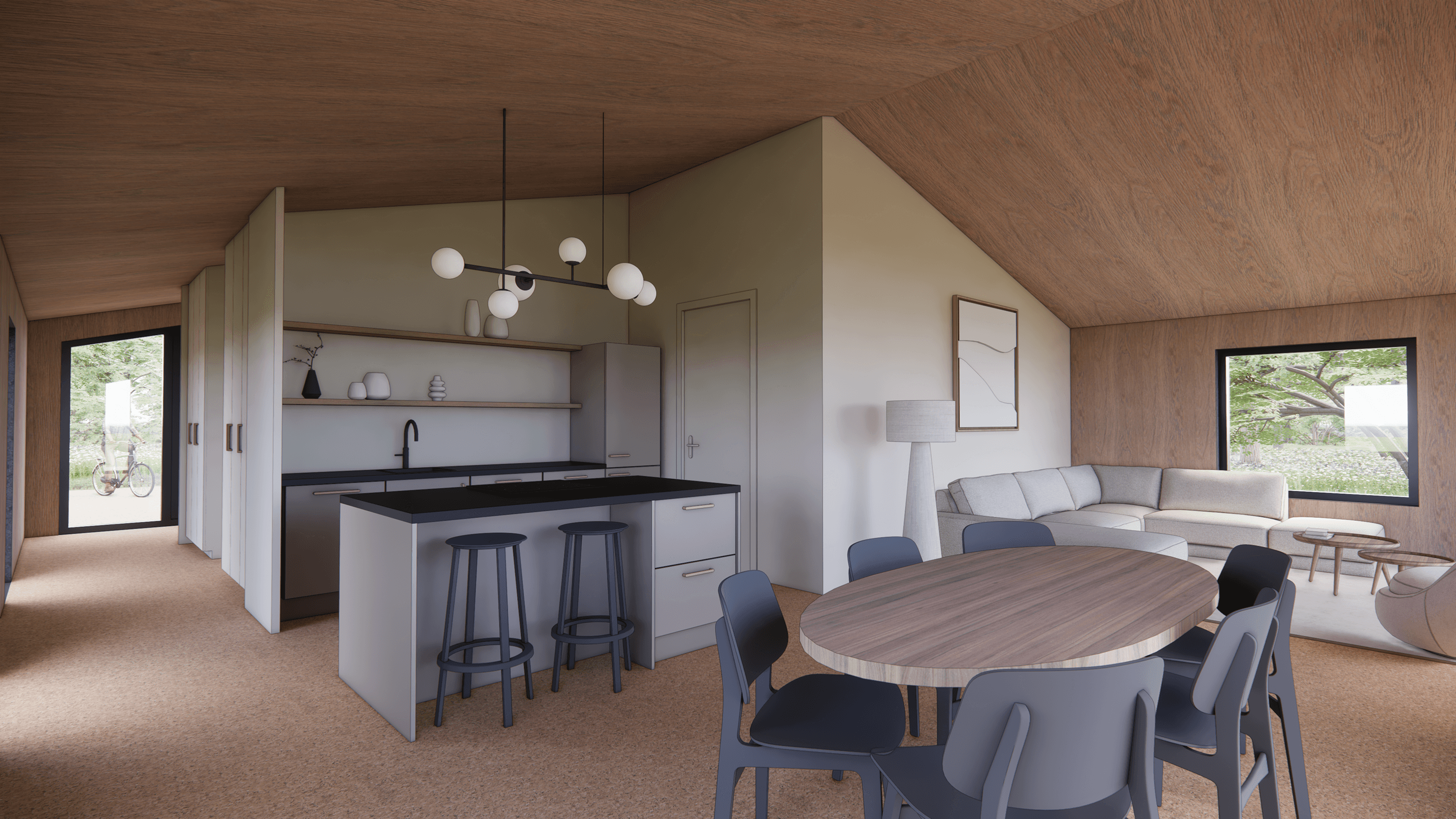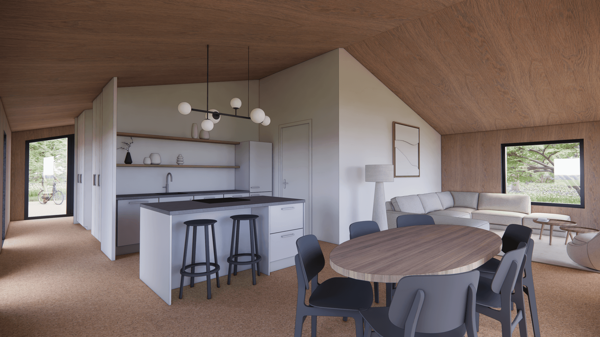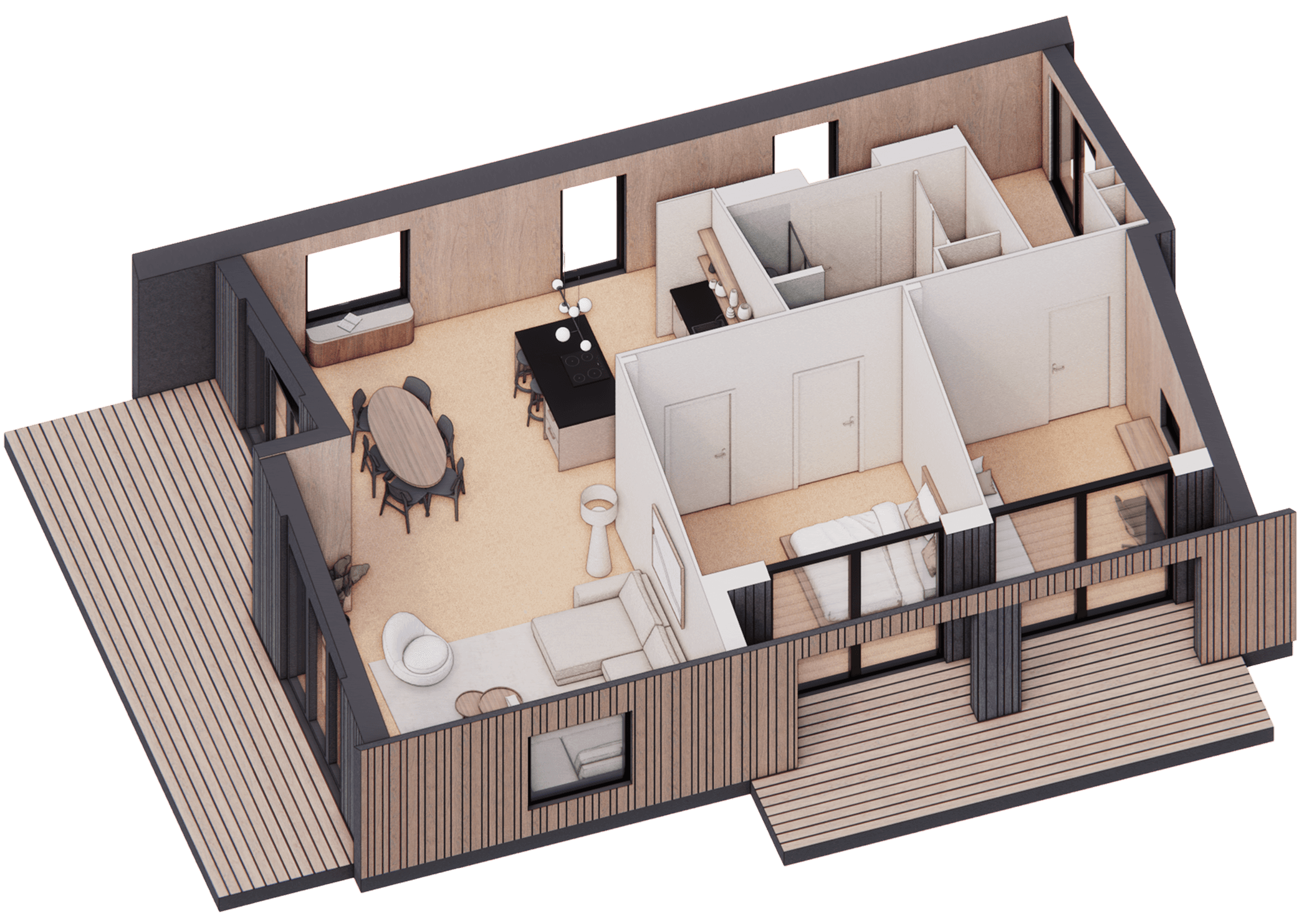 De Millhome 100 heeft één woonlaag met een open leefruimte als het hart van het huis. Wonen, eten en koken lopen hier vloeiend in elkaar over. Grote ramen en openslaande deuren naar de vlonders zorgen voor veel daglicht en een fijne verbinding met buiten.