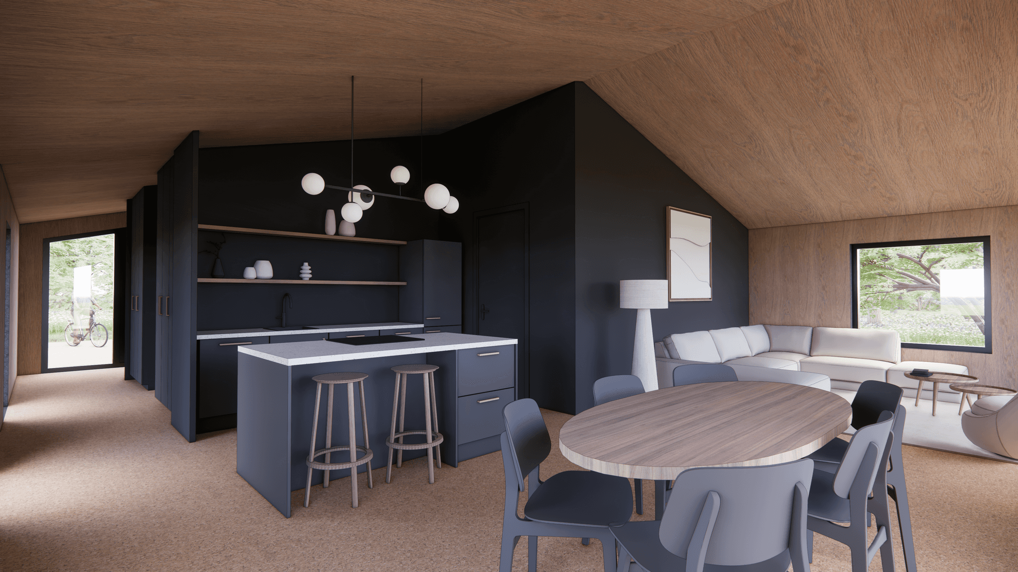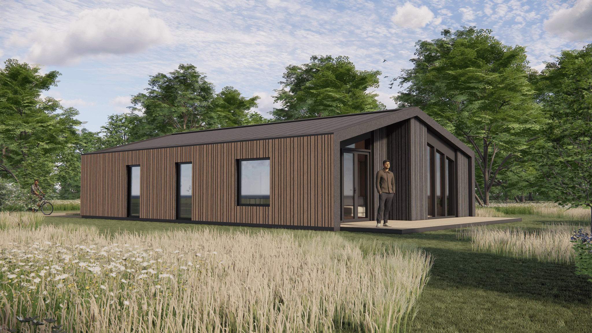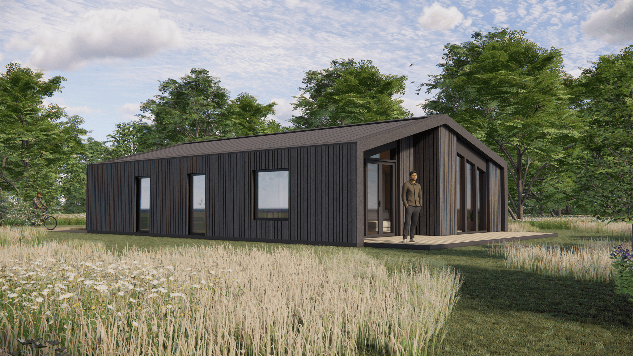 De Millhome 100 heeft één woonlaag met een open leefruimte als het hart van het huis. Wonen, eten en koken lopen hier vloeiend in elkaar over. Grote ramen en openslaande deuren naar de vlonders zorgen voor veel daglicht en een fijne verbinding met buiten.